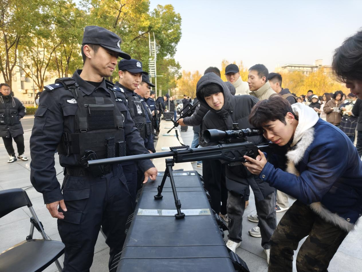 活动现场,最引人瞩目的当属反恐装备展示区。威武的防爆车静静列阵,车身的防护装甲与专业设备彰显着守护力量;各类反恐枪械、无人机等装备整齐陈列,特警队员逐一讲解其性能与实战应用场景,让学生们直观感受国家反恐防控的硬核实力。而身姿矫健的警犬更是成为"人气明星",在训导员的指挥下精准完成搜爆、追踪等科目演示,时而敏捷出击,时而温顺互动,引得同学们阵阵欢呼,不少学生在特警队员的指导下近距离接触警犬,进一步拉近了与反恐工作的距离。